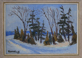 Percy Runnells was born in Elora, Ontario in April 1920. By the time he was attending high school (in the building that is now the Elora Centre for the Arts) he was taking art lessons by correspondence. Runnells served in the Second World War. While stationed in Jamaica he enjoyed painting the local scenery, but during his tour of duty in France he was wounded by shrapnel. At the hospital in Toronto where he convalesced, art was considered therapy, and a room with painting supplies was made available to the veterans. After the war Runnells enrolled at the Ontario College of Art, graduating in 1950. Back in Elora he converted the woodshed in his grandmother's back yard into a studio and began painting the local people, houses, and churches. His station wagon, which served as a mobile studio, was a familiar sight along the country roads where Runnells often stopped to paint farms and the rolling landscape. Throughout his life, his work was related to his passion for art, whether mounting displays at Beatty Bros. in Fergus, doing design and layout for CKCO-TV in Kitchener, or teaching at the Doon School of Fine Art, the Wellington County Board of Education, and St. Margaret's School for Girls in Elora. Runnells also designed two of the stained glass windows at Elora's lovely St. John the Evangelist Anglican Church. Runnells died in April 1989, a village character and favourite, loved by his many students, painter colleagues, and lifelong neighbours alike. |